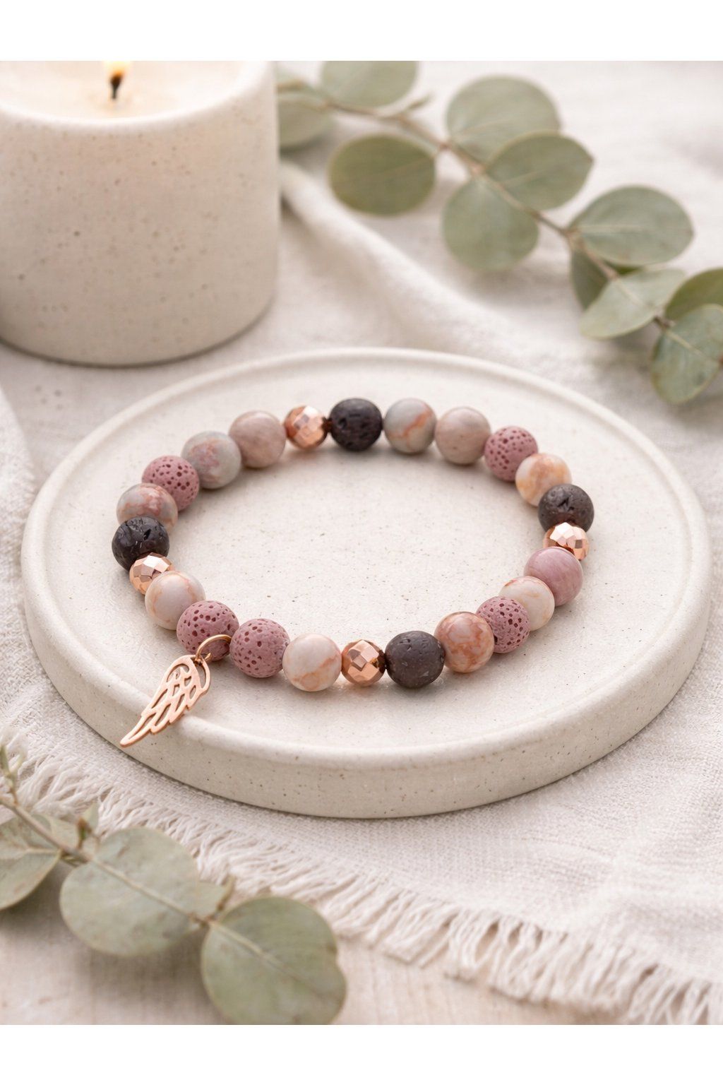 Náramek z minerálu velikosti 8 mm. Standardní velikost náramku 17,5 - 18 cm. Komponenty v barvě rosegold.